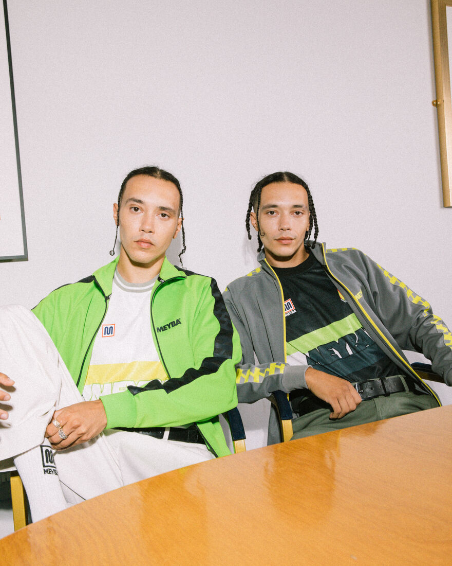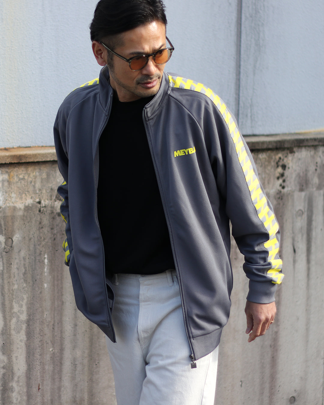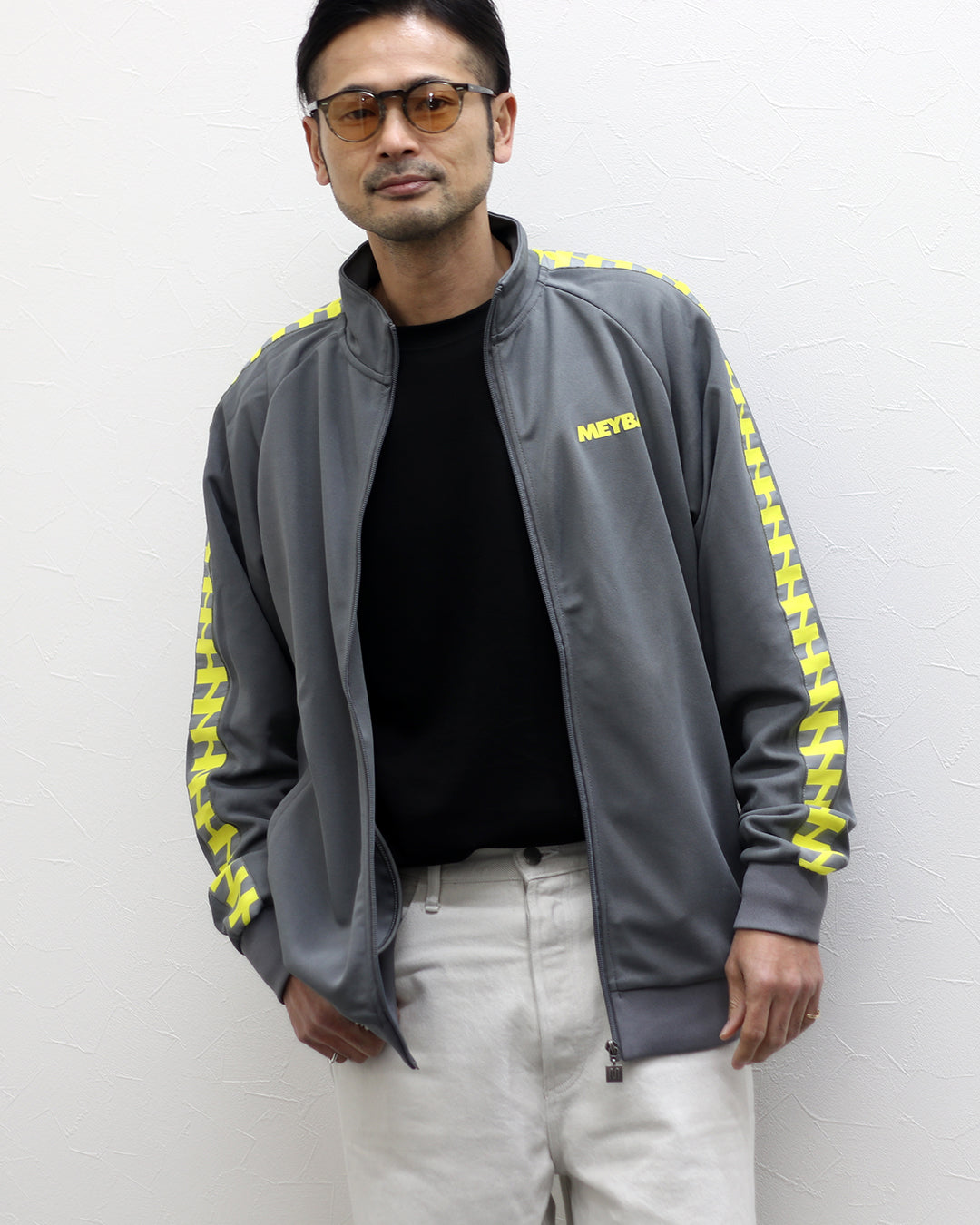 独自のトラックラインがアクセントのスポーティーな一着。 MEYBAらしいレトロな雰囲気の配色がさりげない個性を演出。 メタル調のファスナー金具や裾のピスネームが高級感のあるアクセント。