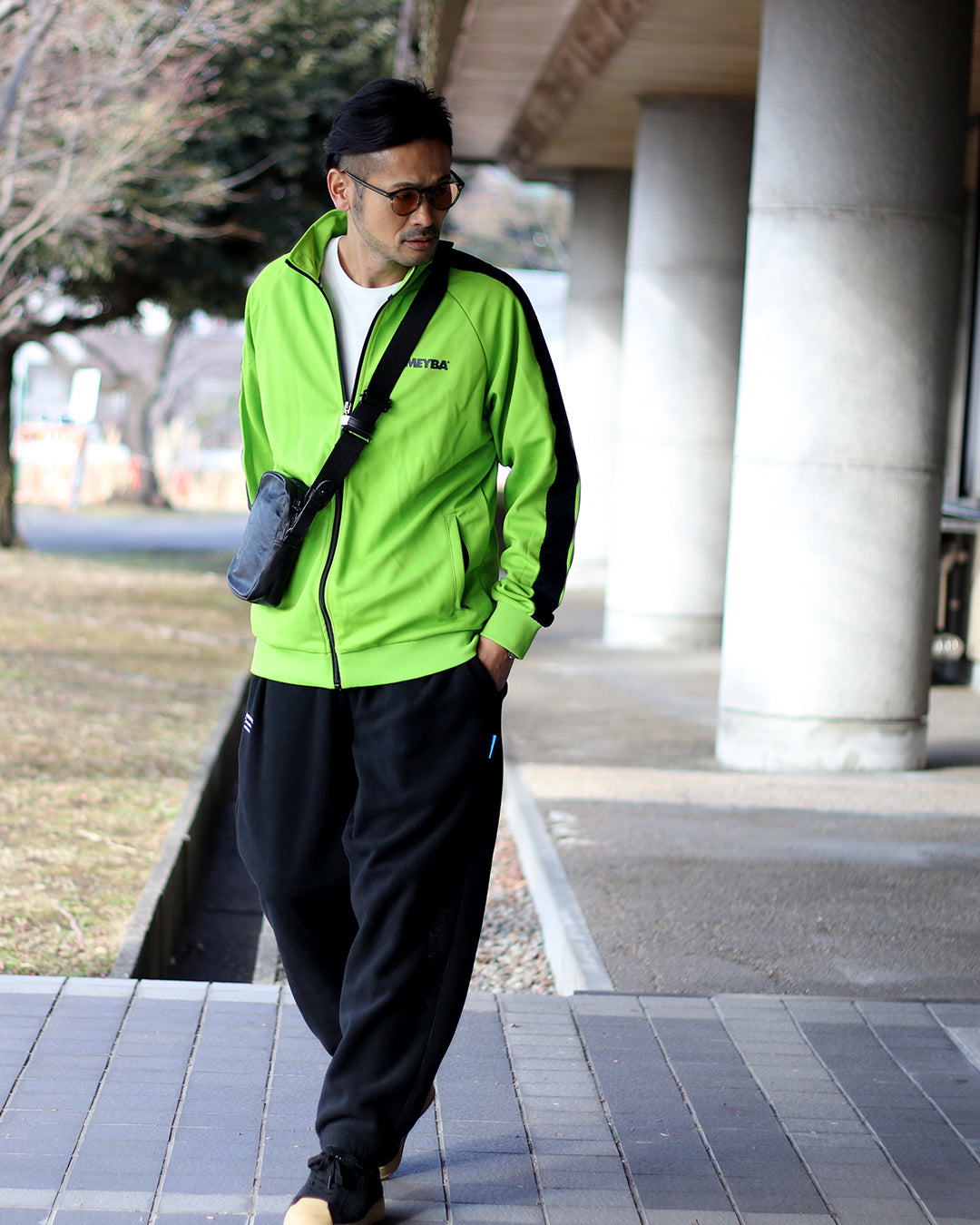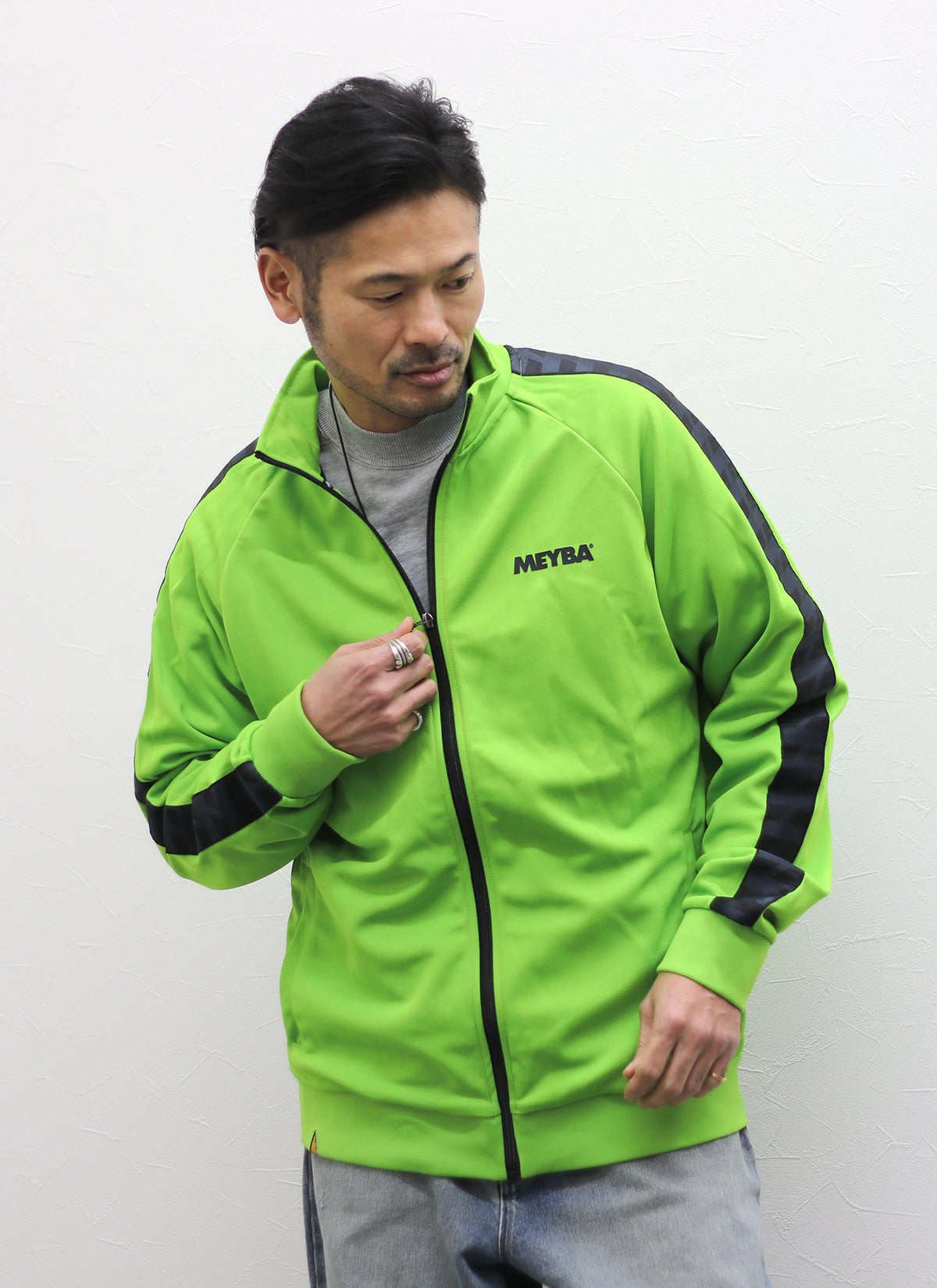 独自のトラックラインがアクセントのスポーティーな一着。 MEYBAらしいレトロな雰囲気の配色がさりげない個性を演出。 メタル調のファスナー金具や裾のピスネームが高級感のあるアクセント。