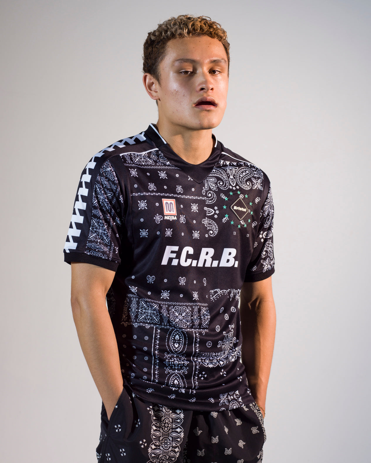 今シーズンのF.C.Real Bristolコレクションを象徴するバンダナパターンのゲームシャツ。
