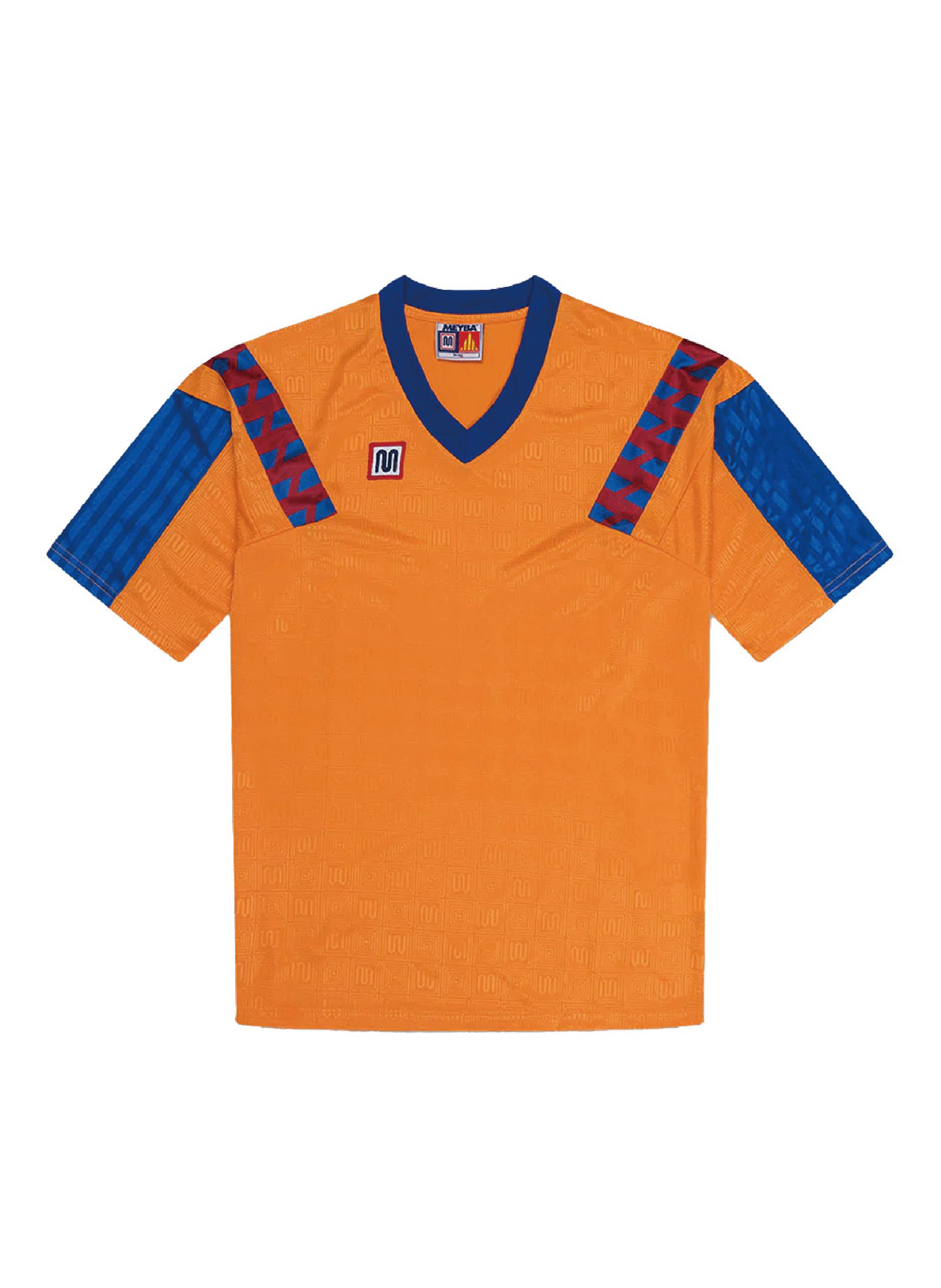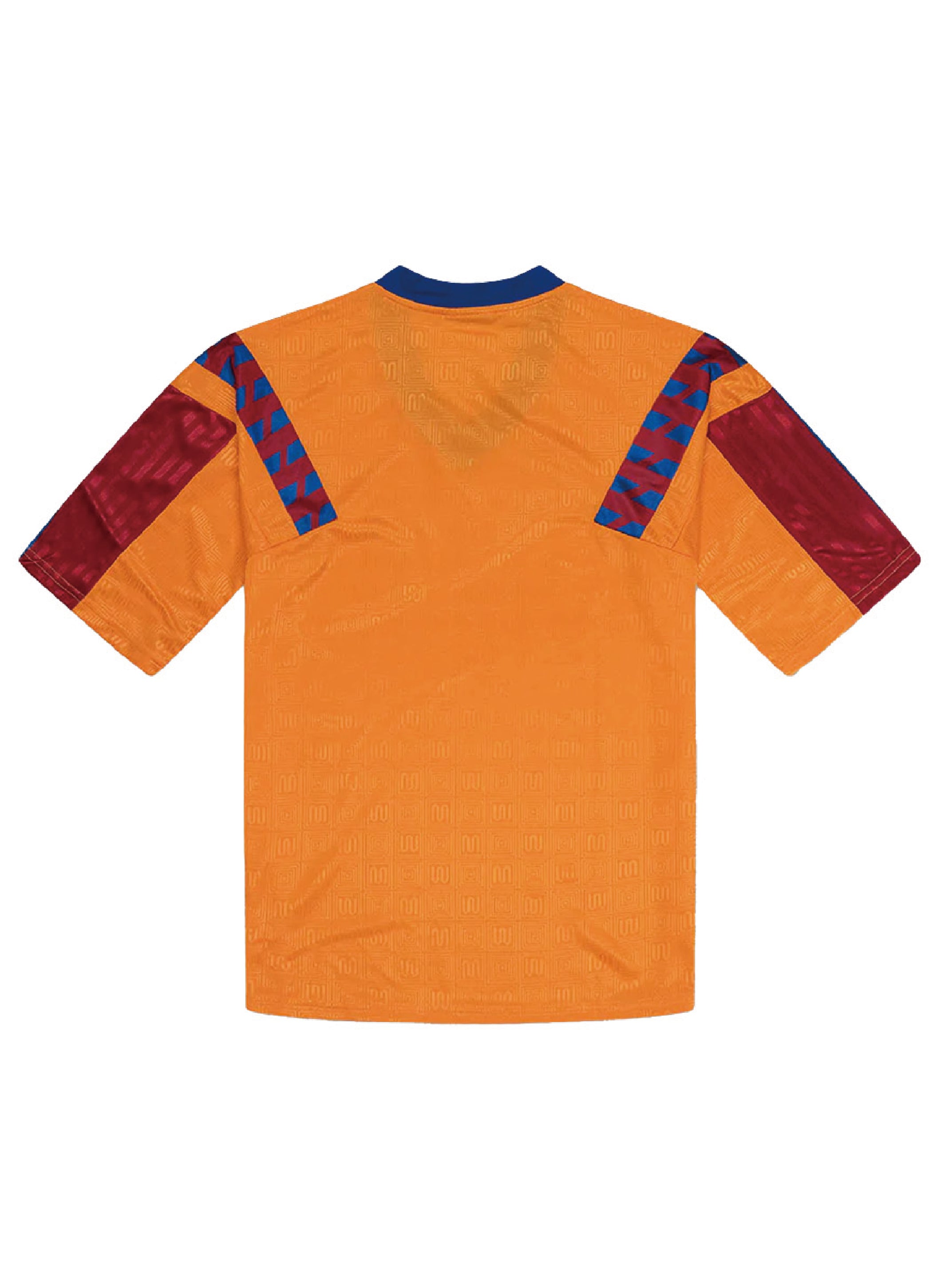FCバルセロナのアウェイユニフォームをイメージした一枚。鮮やかなオレンジにブルーとレッドが目を引きサッカーファンでなくても欲しくなる。